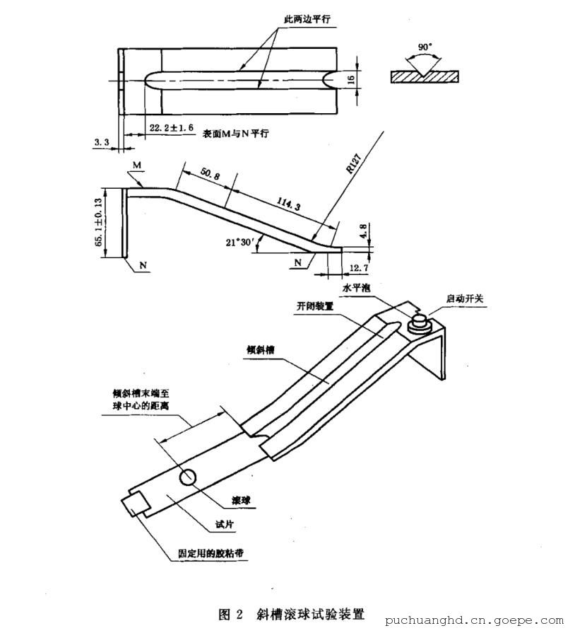 1.2.4把滚球安置在规定的起始位置,操纵控制杆,使滚球滚下,测定滚球停止滚动的距离。该距离是指图2中所示的,从倾斜槽末端到滚球停止时与胶粘面接触的中心点之间的长度。