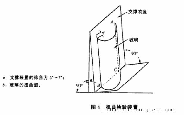 把玻璃放在一个90°的检测支撑装置内测量扭曲值,支撑装置的仰角为5°~7°,玻璃下角与装置的两表面的交线相接触,其他角尽量靠近竖平面,然后用*小刻度为0.5mm的钢直尺测量其他角离开装置另一表面的实际距离即为扭曲值。如图4.
