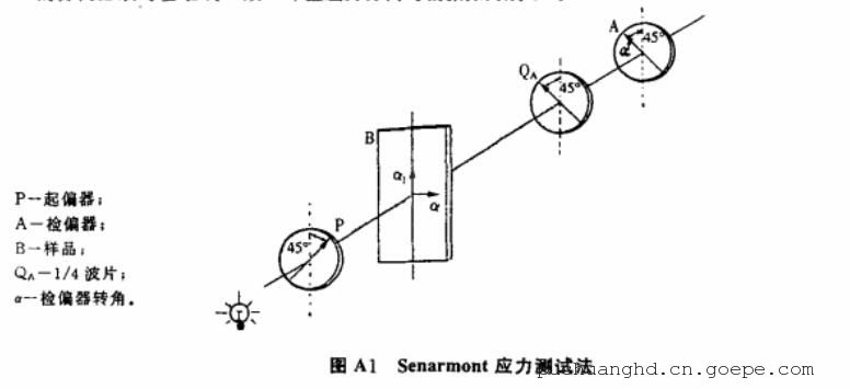 推荐使用Senarmont应力测定法,此种方法采用的应力仪的各光学元件及其方向匹配关系参照附图A1.起偏器及检傌器的偏振方向均须与基准线成45°,它们之间必须相互垂直。被测样品主应力之一的方向必须与基准线一致,即主应力方向与偏振方向成45°.